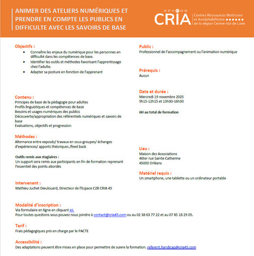Rappel : En fonction des besoins et compte-tenu des difficultés particulières liées au handicap, des adaptations peuvent être mises en place pour permettre au stagiaire de suivre la formation. Si vous êtes dans cette situation, merci de prendre con,tact avec le référent handicap de l'espace C2B#CRIA45 : referent.handicap@cria45.com